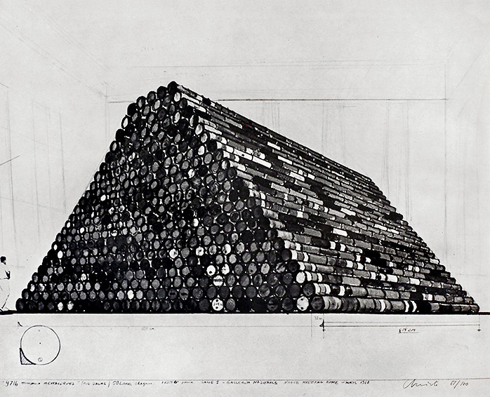 Titel: ohne Titel Vita Christo (* 13. Juni 1935 in Gabrowo, Bulgarien); † 31. Mai 2020 in New York City wurde bekannt, nachdem er sich 1960 der von Pierre Restany und Yves Klein in Paris gegründeten Gruppe „Nouveau Réalisme“ („Neuer Realismus“) angeschlossen hatte, wiewohl er nie offizielles Mitglied der Gruppe war. Wie bei den meisten Protagonisten der aus dem Nouveau Réalisme hervorgegangenen soziologisch inspirierten Kunstauffassung entwickelte sich seine Kunst ursprünglich aus der Assemblage. Später realisierte Christo zusammen mit seiner Frau Jeanne-Claude (* 13. Juni 1935 in Casablanca) † 18. November 2009 in New York City Verhüllungsaktionen an Gebäuden und Großprojekte in Landschaftsräumen, Industrieobjekten oder bekannten Bauwerken. |